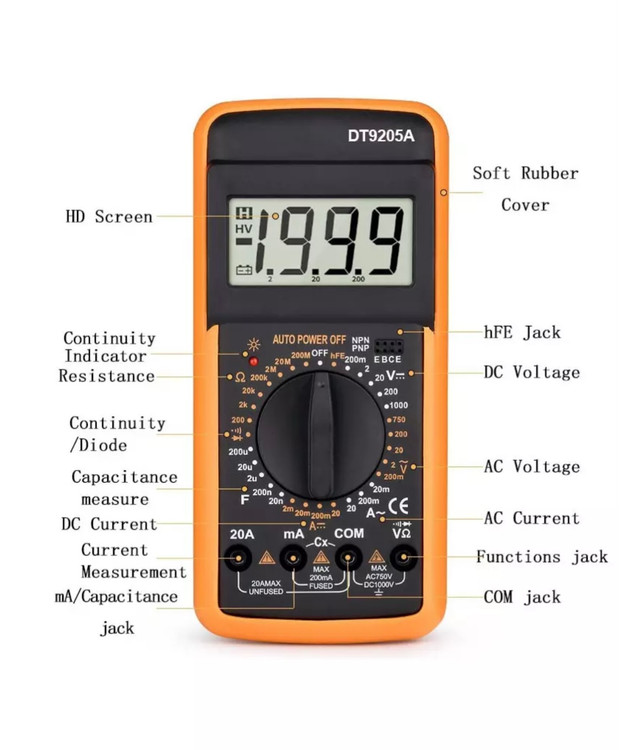 سنجش و تست ولتاژ و جریان و دیگر پارامترهای الکترونیک در بسیاری از موارد اهمیت دارند. با استفاده از مولتی متر Multimeter میتوانیم تمامی پارامترهای مورد نیاز را بسنجیم. این مولتی متر با کد تجاری DT9205A از تولیدات چین میباشد. امکانات و رنج کاری این مولتی متر را در قسمت مشخصات فنی بررسی کنید.